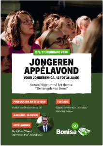 Op D.V. vrijdag 27 februari zal er in de Pauluskerk een jongerenappélavond worden gehouden t.b.v. Bonisa, voor jongeren van ca. 12-35 jaar. Het thema is ‘De vreugde van Jezus’. Aanvang 20.00 uur.